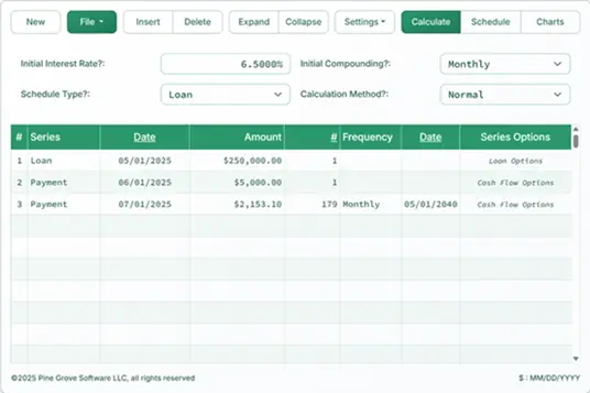 — solve for payment, term, rate or loan amount. Supports normal loans as well as Rule-of-78s and fixed principal payment loans.